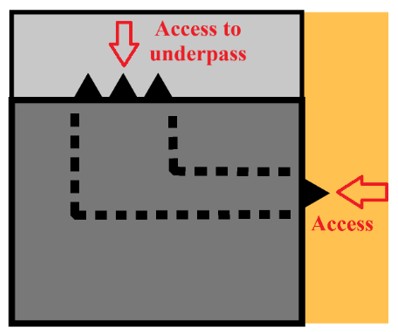 - Dotted lines are also used to define an underpass or tunnel beneath a building or the ground as illustrated below. The saw teeth indicate which direction the underpass can be accessed from.