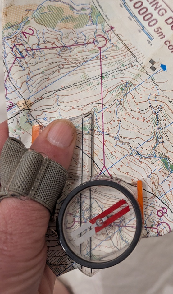 - Use your compass: The tip of your compass can act as a “proxy” thumb, helping you stay oriented and quickly return your focus to the right spot on the map.